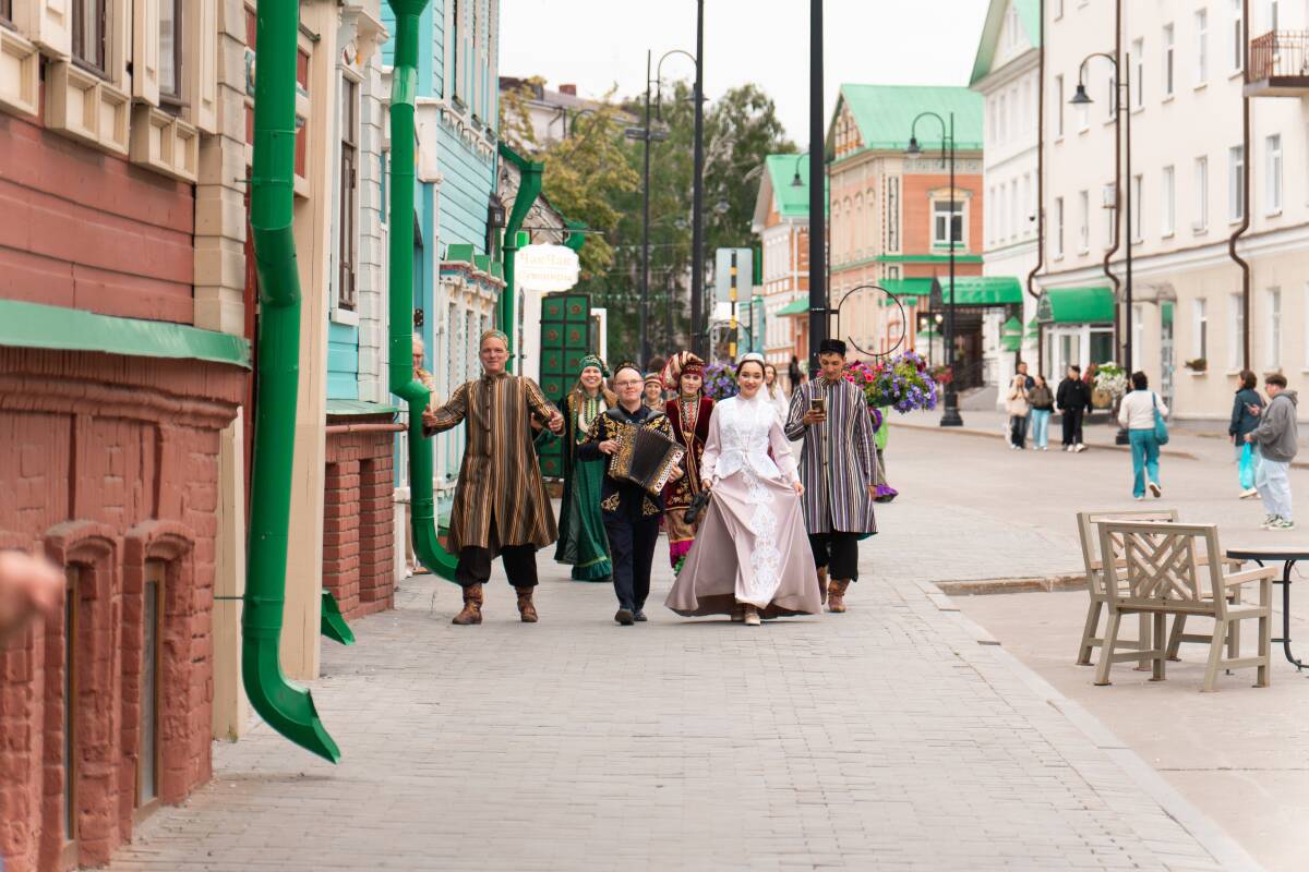 Так и есть: зрителя вовлекают в действо с первых минут. Билет выполнен в виде либретто спектакля, из которого пришедшие узнают о сюжетных перипетиях предстоящего шоу. Функцию фойе, где зрители ожидают начала представления, выполняет атмосферная улица Каюма Насыри – сердце Старо-Татарской слободы. У ворот Дома купца Муллина гармонист развлекает гостей и прохожих народными песнями и татарским ретро.