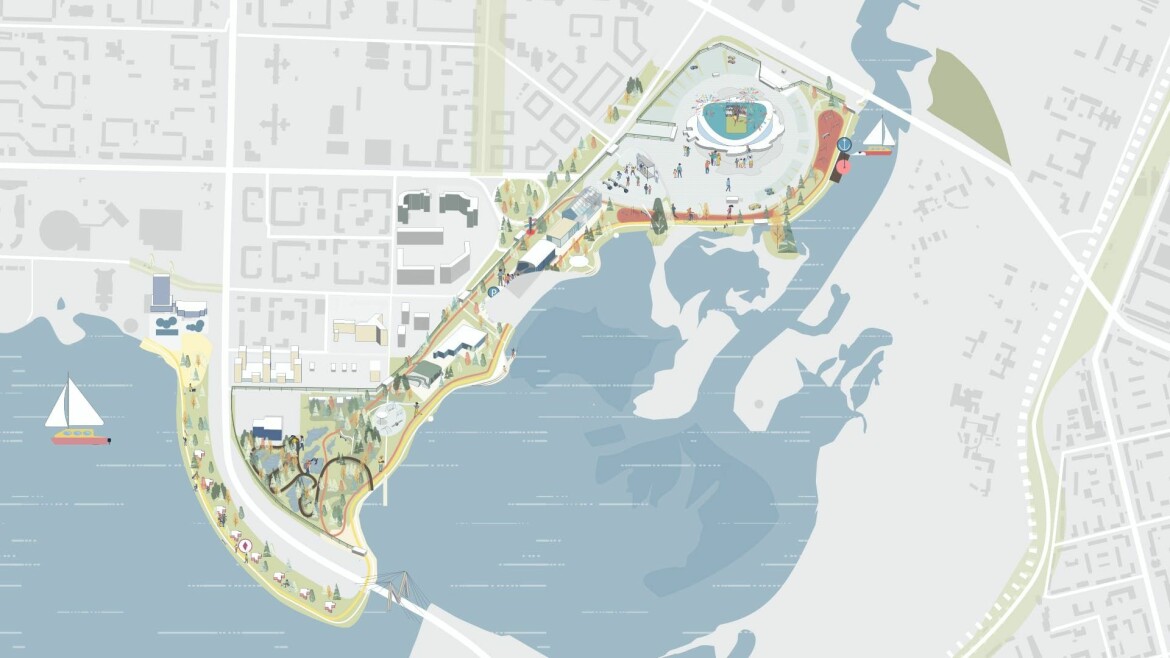 Акцент предполагается сделать на зону набережной. На ней будут организованы беговые, велосипедные и рекреационные маршруты. Это создаст точки притяжения в отдалении от больших объектов и в то же время сохранит спортивную тематику парка.