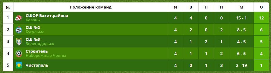 Казанцы обыграли «Чистополь» (8:0), зеленодольскую «СШ №3» (3:0), бугульминскую «СШ №2» (2:0) и «Строителя» из Набережных Челнов (2:1).