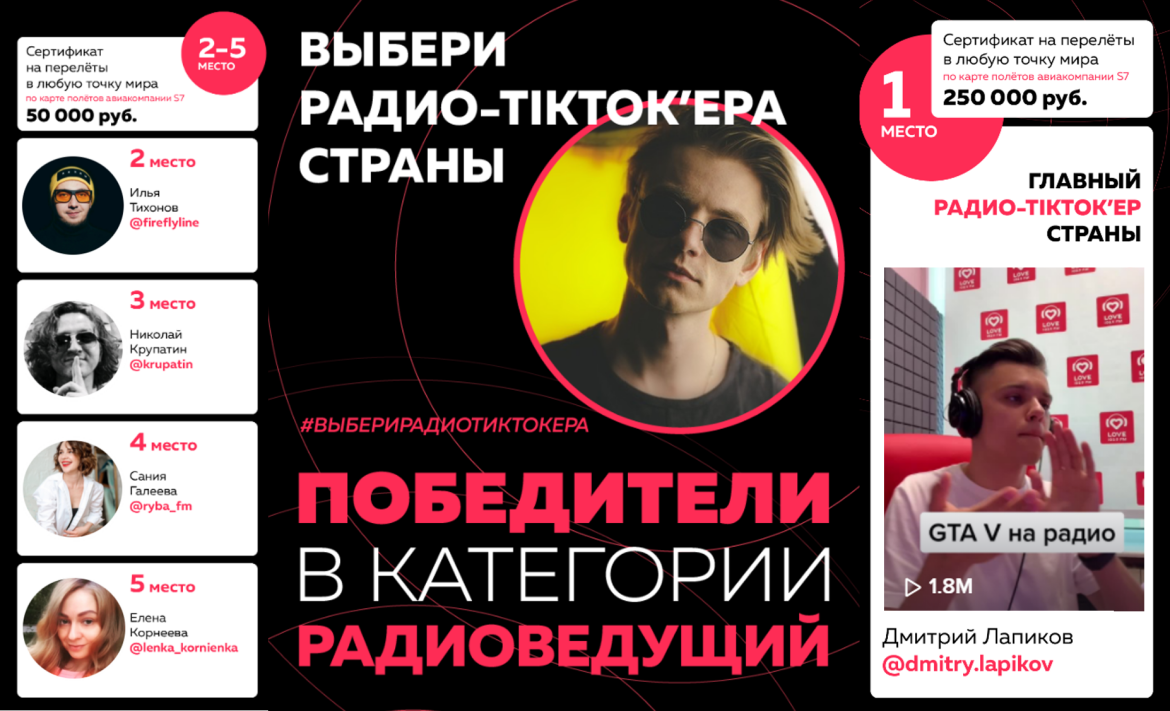 Пользователи ведущей платформы коротких видео TikTok выбрали лучшего радиотиктокера России. Им стал Дмитрий Лапиков, ведущий Love Radio в Калининграде.