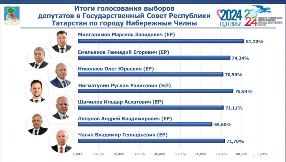 Предварительные итоги голосования по одномандатным избирательным округам на территории города Набережные Челны следующие. В Комсомольском избирательном округе №17 жители поддержали Марселя Мингалимова — он получил 81,20% голосов. В Мелекесском избирательном округе №18 лидером стал Геннадий Емельянов — 74,34%. В Центральном избирательном округе №19 70,90% избирателей проголосовали за Олега Николаева, а в Электротехническом избирательном округе №20 75,94% — за Руслана Нигматулина.