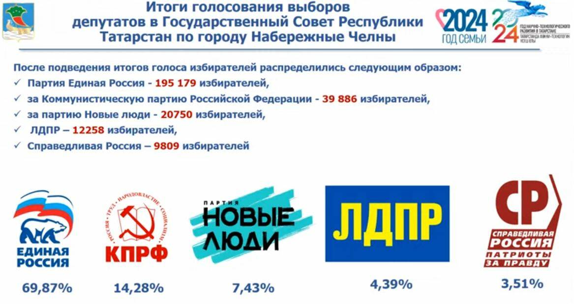 Согласно данным ЦИК РТ, по результатам предварительных итогов голосования после обработки 100% протоколов по единому республиканскому избирательному округу всероссийская политическая партия «Единая Россия» набрала 76,75%, КПРФ — 10,54%, ЛДПР — 4,41%, «Новые люди» — 4,21%, «Справедливая Россия — Патриоты — За правду» — 3,27%.