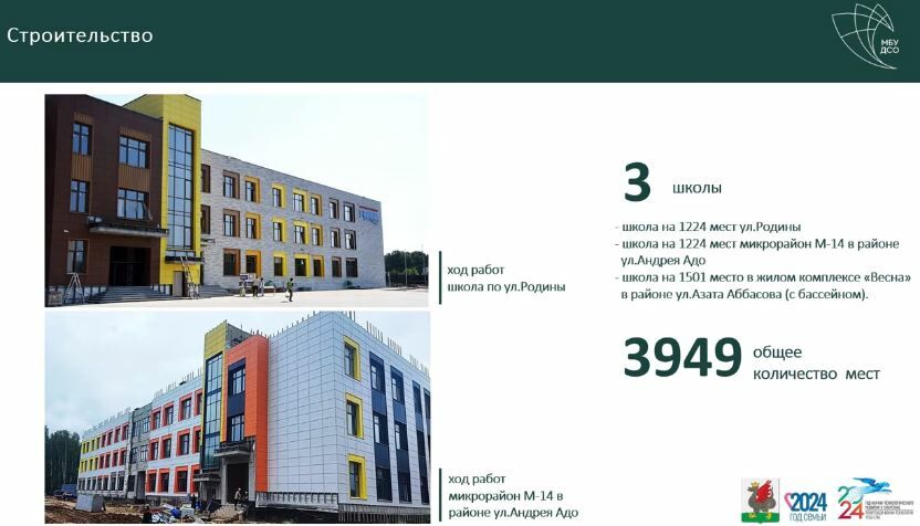 «В образовательных учреждениях предусмотрены столовые, библиотеки, спортивные и актовые залы. Территории школы оборудованы спортивными площадками и зонами отдыха, работы выполнены на 75%», — доложил спикер.