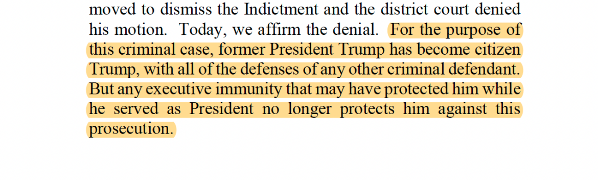 «<…> бывший Президент Трамп стал гражданином Трампом, обладающим всеми средствами защиты, которые присущи любому другому обвиняемому по уголовному делу. Но любой иммунитет, который мог защитить его, пока он занимал пост Президента, больше не защищает его от преследования», — сказано в решении, единогласно принятом коллегией из трех судей.