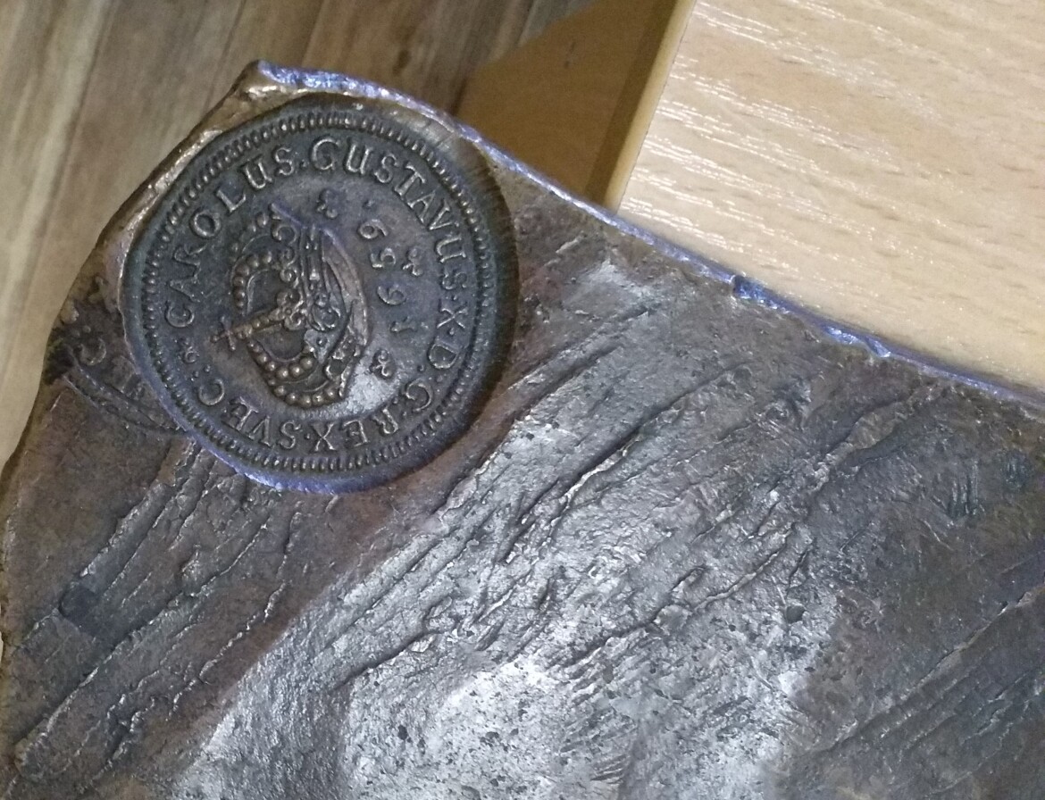 В клеймах по четырем углам плиты изображена шведская королевская корона с датой 1659. Вокруг короны надпись по кругу: CAROLUS. GUSTAVUS X D G: REX•SVEG, что значит «Карл Густав Х Б(ожьей) М(илостью) кор(оль) Шве(ции)».