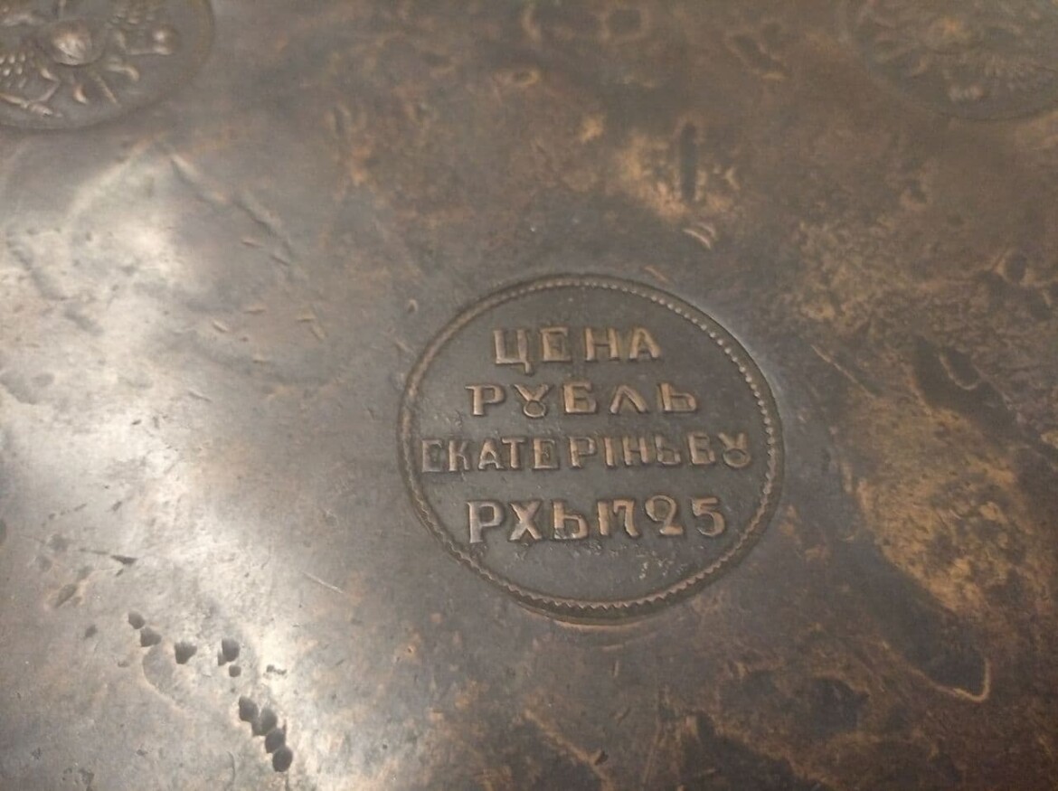 «По примеру Швеции Петр I решил в России чеканить большие полноценные монеты номиналом 10 рублей и номиналом 1 рубль. Но Петр I сам их уже не увидел, потому что он умер в январе 1725 года, а выпуск таких монет начали на Урале в 1726 году при Екатерине I, уже после его смерти. В середине указана цена, город и дата, по краям четыре клейма, чтобы медь не срезали», – сообщила собеседница агентства.
