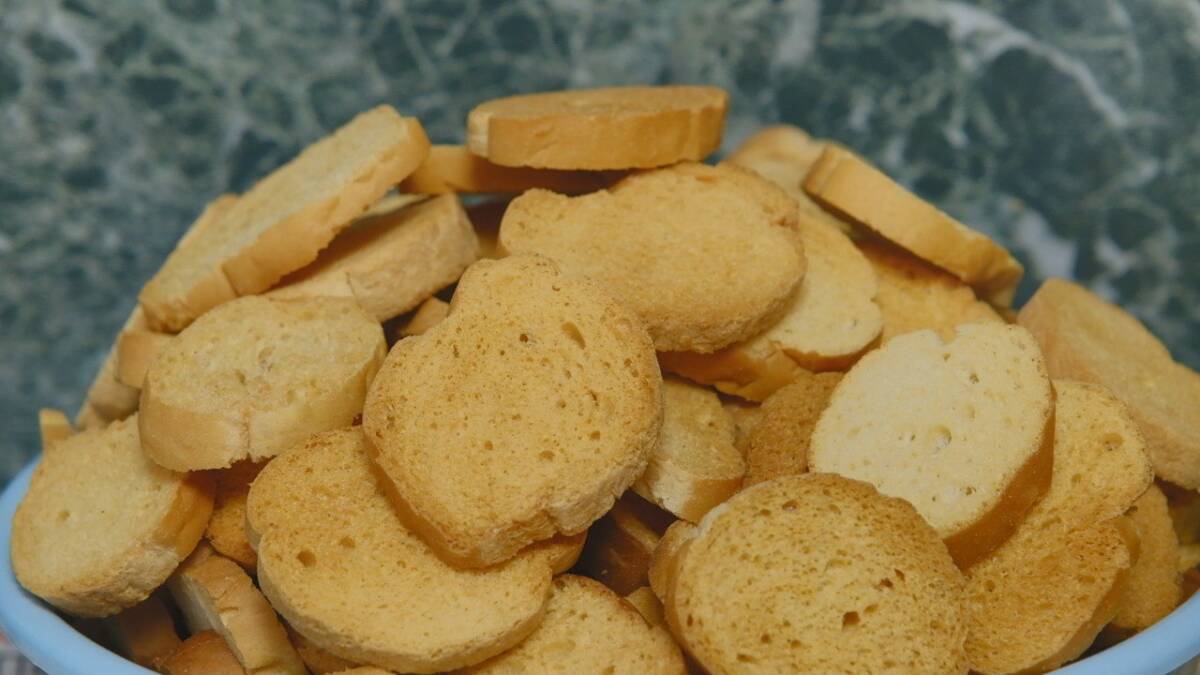 Производство сухарей – процесс небыстрый. Любовь делится: сначала нарезает хлеб, дает ему полежать, чтобы ушла лишняя влага, а затем подсушивает в духовке.
