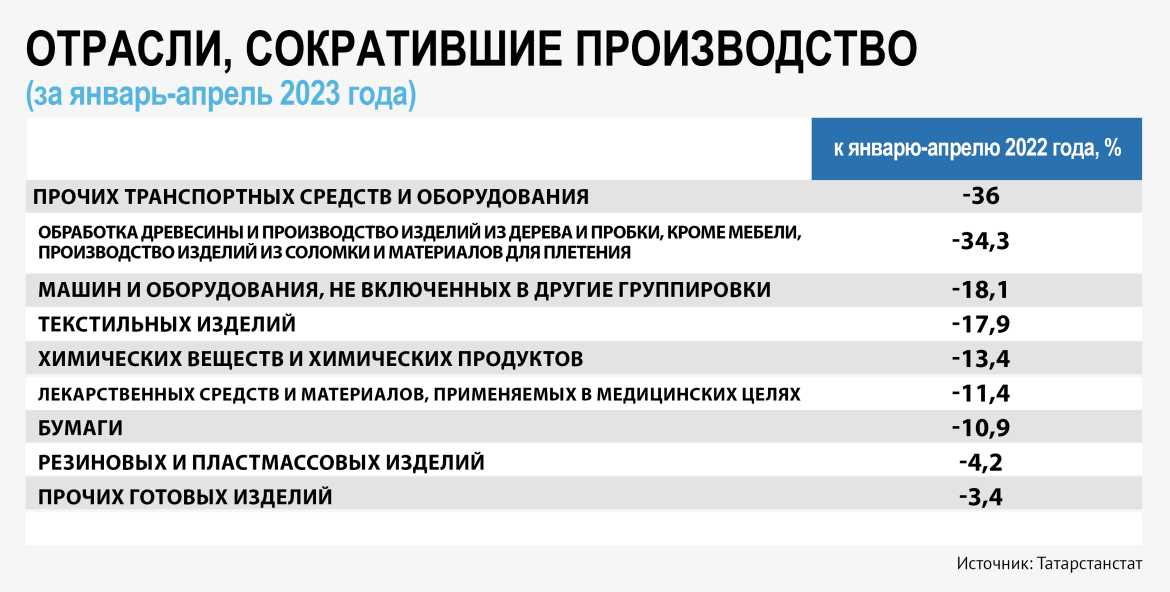 Сегментов, показавших падение производства, за январь – апрель 2023 года осталось девять. Отметим лишь, что две отрасли – производство резиновых и пластмассовых изделий, а также прочих транспортных средств – за рассматриваемый период по России сработали с плюсом, причем в последнем случае – на 14,6%. В Татарстане же пока света в конце тоннеля в этой отрасли не просматривается. Ждем итогов мая, так как спуск нового скоростного пассажирского судна на подводных крыльях «Метеор-2020» «Михаил Девятаев», произведенного для нужд Татарстана, на Зеленодольском судостроительном заводе состоялся именно в этом месяце.
