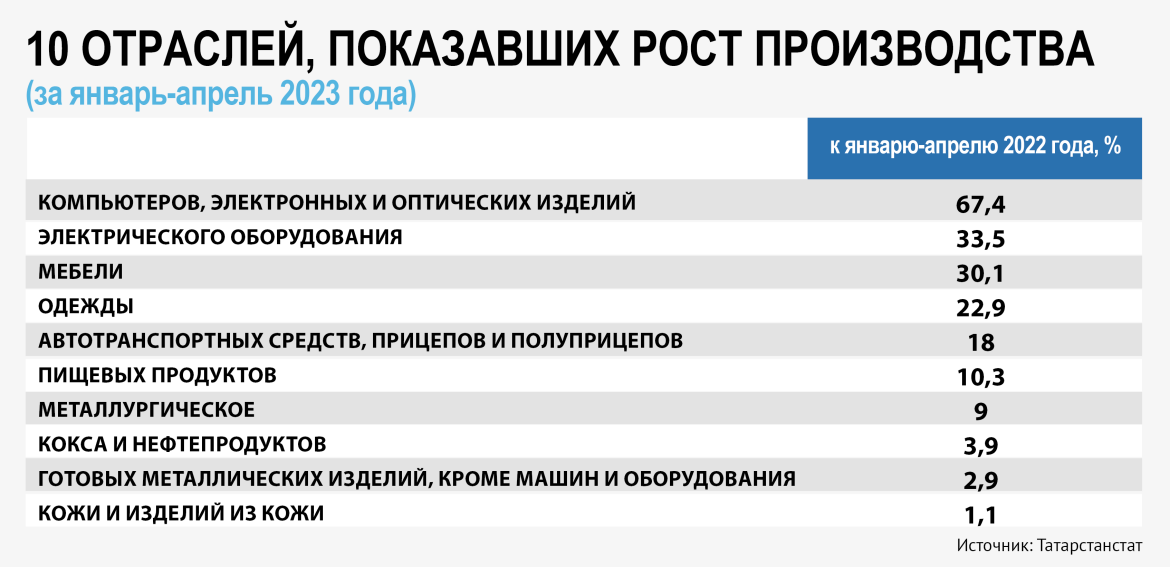 Рекордсмены же по динамике роста в Татарстане не меняются – это производства компьютеров, электронных и оптических изделий, а также электрического оборудования. Эти же две отрасли растут и в целом по стране, и тоже двузначными, но более низкими темпами – на 18,7% и 13,4% соответственно.