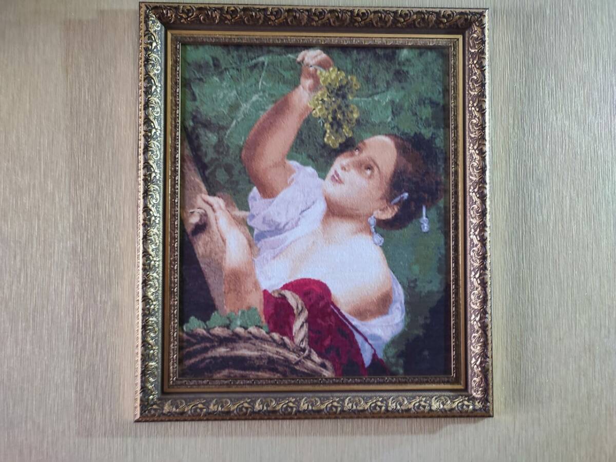 Показав на одну из них, искусница рассказала: «Эту работу под названием „Материнская любовь“ по мотивам автопортрета французской художницы Элизабет Виже-Лебрён я вышивала 11 месяцев. Здесь 86 тонов, нитки подбирала сама. Наборы для вышивания крестиком очень дорогие, когда-то мне их щедро дарила родственница Зоя. По нынешним меркам эта картина стоит 38 тыс. рублей».