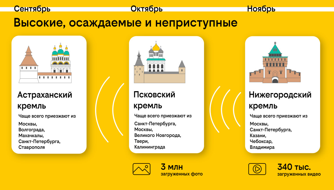 Туристы продолжают активно путешествовать по кремлям и осенью. Например, посетители Астраханского кремля больше всего используют мобильный интернет именно в сентябре. Кстати, именно здесь расположена самая высокая из колоколен в ансамбле кремлей, которую видно практически из любой точки города, — Надвратная соборная колокольня (80 метров).
