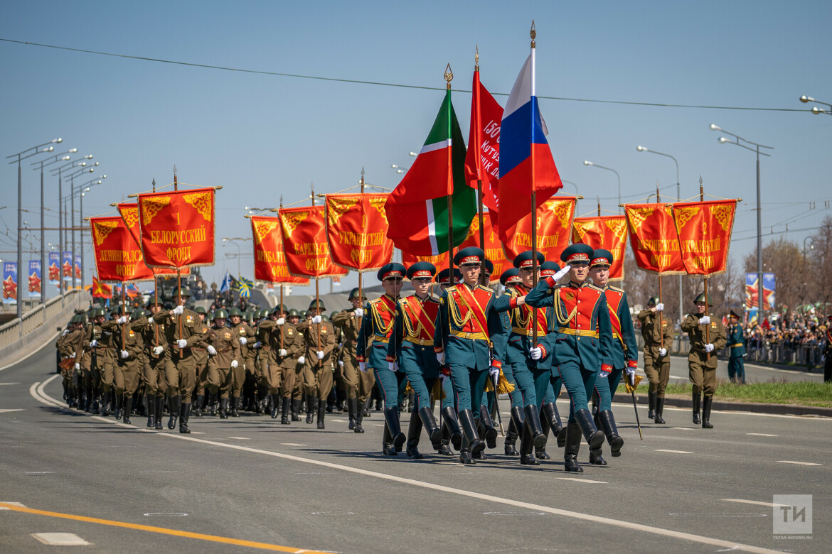 После этого по площади Тысячелетия прошла знаменная группа с государственными флагами России, Татарстана и Знаменем Победы, а также со штандартами фронтов Великой Отечественной войны. Знамя Победы нес курсант Казанского высшего танкового командного ордена Жукова Краснознаменного училища Марсель Губайдуллин, дед которого сражался с захватчиками под Москвой в 1941 году и принимал участие во взятии Берлина.