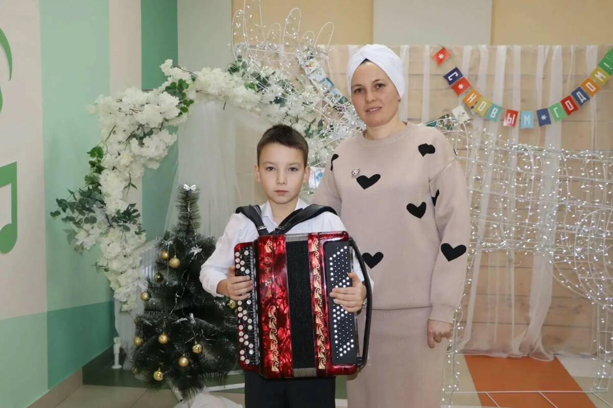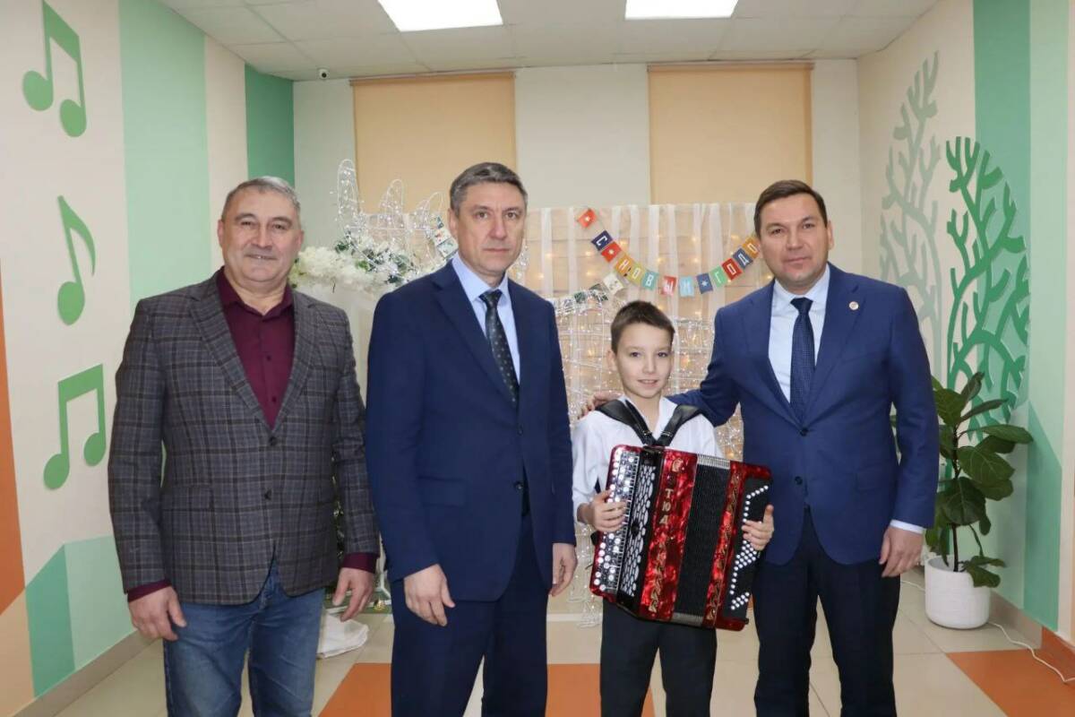 Заместитель министра культуры Республики Татарстан Ленар Хакимзянов и глава Апастовского района Айрат Зиганшин подарили баян сыну участника специальной военной операции Руслана ХайрутдиноваИсламу.