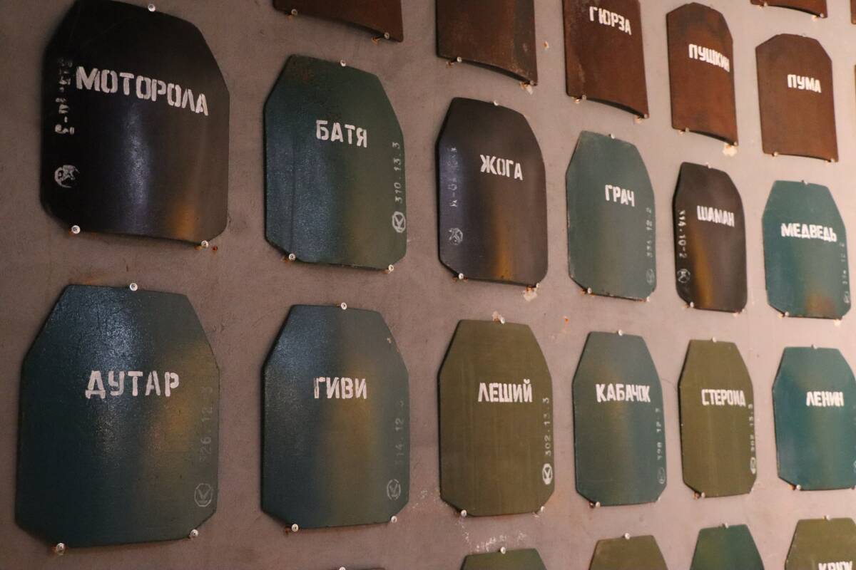 Остановившись у стены памяти с нагрудными плитами от бронежилетов павших бойцов, ветеран рассказывает про позывные.