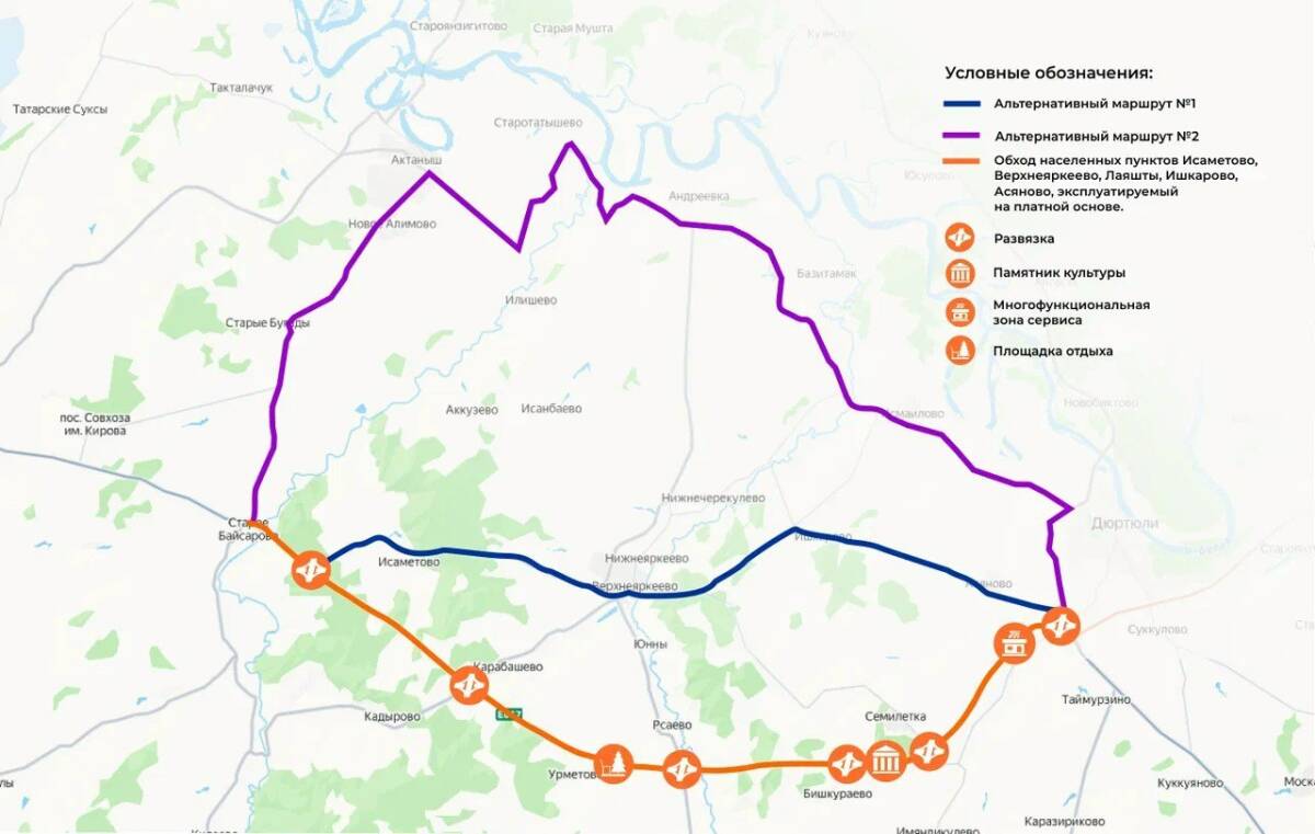 У платного участка трассы М12 есть два альтернативных маршрута. Первая бесплатная дорога проходит в границах населенных пунктов Исаметово, Верхнеяркеево, Лаяшты, Ишкарово, Асяново. Протяженность этого маршрута составляет 63 километра, но движение – двухполосное.