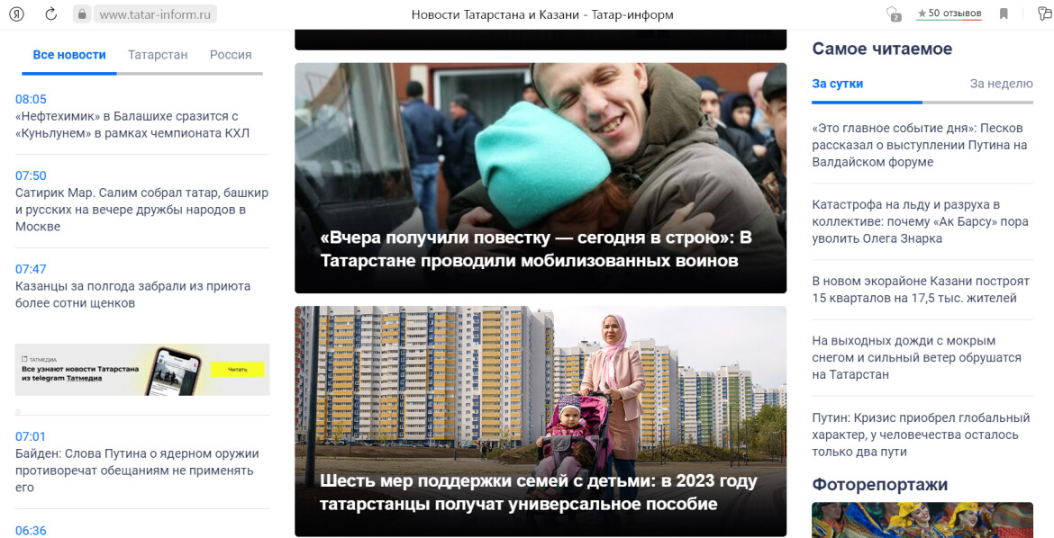 В июле – сентябре на центральной ленте «Татар-информа» было опубликовано 535 статей. Какие же материалы оказались самыми читаемыми? Нетрудно догадаться, что в публикациях агентства нашли отражение специальная военная операция России на Украине, призыв на службу, а затем и объявленная в связи с этим частичная мобилизация. В первой двадцатке самых читаемых материалов этой теме так или иначе посвящены 7 статей. Это советы опытных бойцов татарстанцам, убывающим в зону СВО, о том, как собрать свой армейский рюкзак, разъяснения Минобороны о принципах призыва, а также о том, как в Татарстане будет проходить частичная мобилизация .
