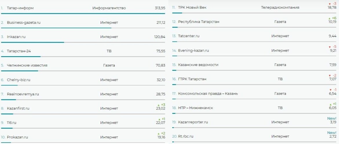 В первом квартале этого года в топ-20 самых часто упоминаемых СМИ Татарстана «Татар-информ» уступал пальму первенства газете «Бизнес Online». На третьем месте тогда был Inkazan, четвертое занимала газета «Челнинские известия». Замыкал же первую пятерку телеканал «Татарстан-24». Однако уже во втором квартале информагентство не только уменьшило разрыв, но и опередило недавнего лидера. Индекс цитируемости у «Татар-информа» оказался равен 304,12 балла против 199,25 у ближайшего конкурента.