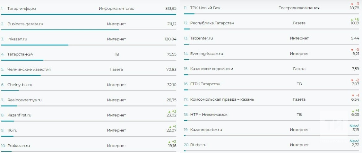 Индекс цитируемости «Татар-информа» составил 313,95 балла. В двадцатке лидеров оказались и другие ресурсы АО «Татмедиа». Это, в частности, телеканал «Татарстан 24» (4-е место), газеты «Челнинские известия» (5-е место) и «Казанские ведомости» (15-е место) и «НТР — Нижнекамск» (18-е место). ТРК «Новый Век» заняла 11-е место.