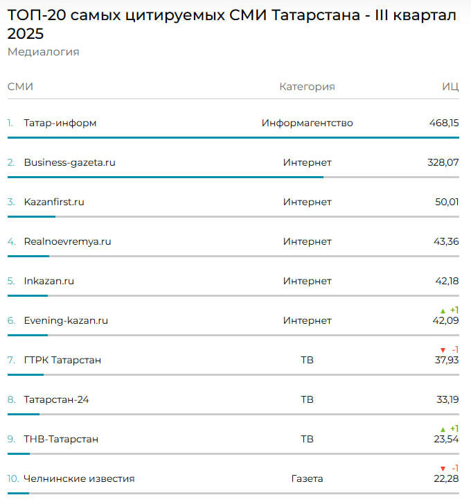 Информационное агентство «Татар-информ» стало самым цитируемым татарстанским СМИ за третий квартал 2025 года. Топ-20 опубликован на сайте «Медиалогия».
