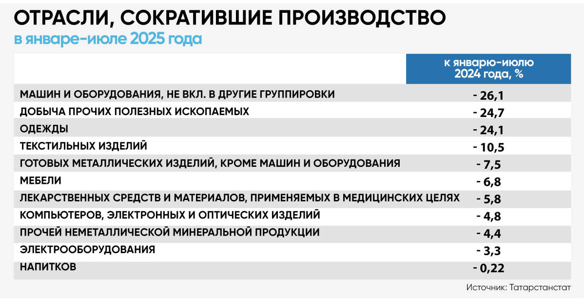 При этом 15 отраслей из тех 20, по которым Татарстанстат все еще раскрывает информацию, в том числе и системообразующие для республики химпром и машиностроение, в июле оказались в числе отстающих. Правда, в плюс сработала нефтепереработка (но на 12,2%), доля которой в промышленности превышает 20%.