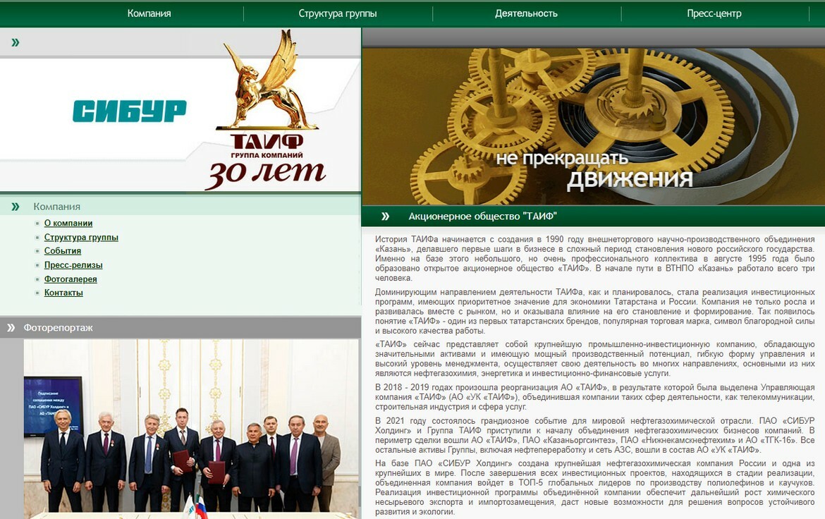 Интересно, что пока продолжает работать старый сайт «ТАИФа». По данным СПАРК, домен taif.ru принадлежит «СИБУРу». На сайте под логотипом федерального холдинга размещены вехи почти 30-летней истории группы ТАИФ, актуальные контакты и устаревший новостной контент, датированный 2021 годом.