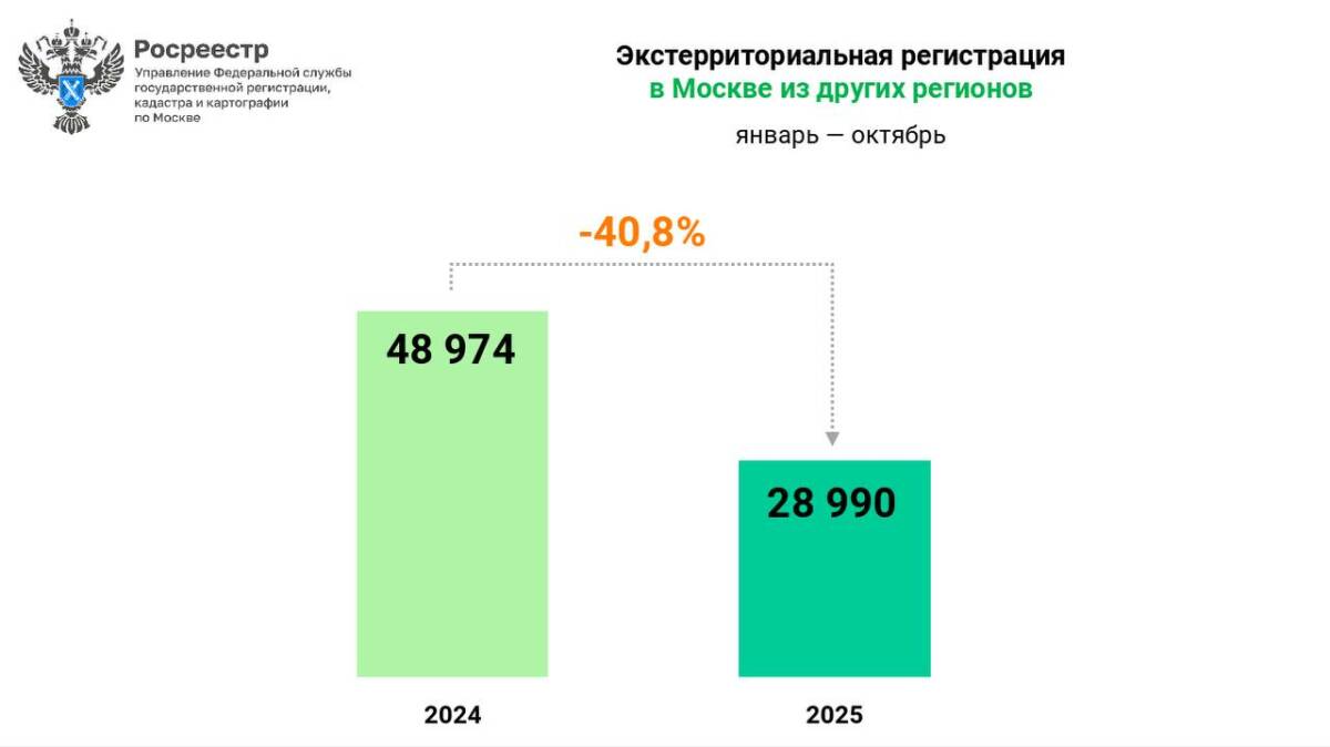 В общей сложности с января текущего года в Москву из других регионов РФ поступило 28 990 заявлений на регистрацию прав собственности и кадастровый учет столичной недвижимости. Это на 40,8% меньше, чем за январь-октябрь 2024-го (48 974).