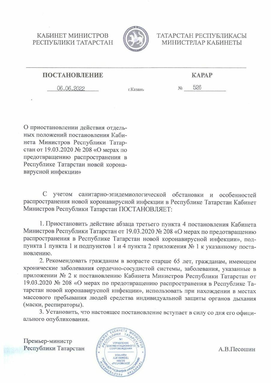 6 июня того же года в РТ масочно-перчаточный режим отменили в некоторых общественных местах. С этого момента ограничение действовало только в транспорте, магазинах и объектах оказания услуг, причем в этих случаях необходимы были также и перчатки.