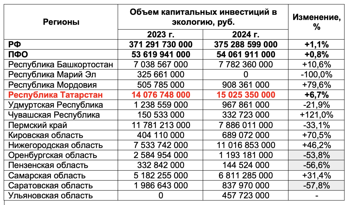 В целом по Приволжскому федеральному округу экологические инвестиции бизнеса превысили 54 млрд рублей, практически не изменившись по сравнению с 2023-м. Доля Татарстана, таким образом, составила примерно четверть от общеокружных объемов.
