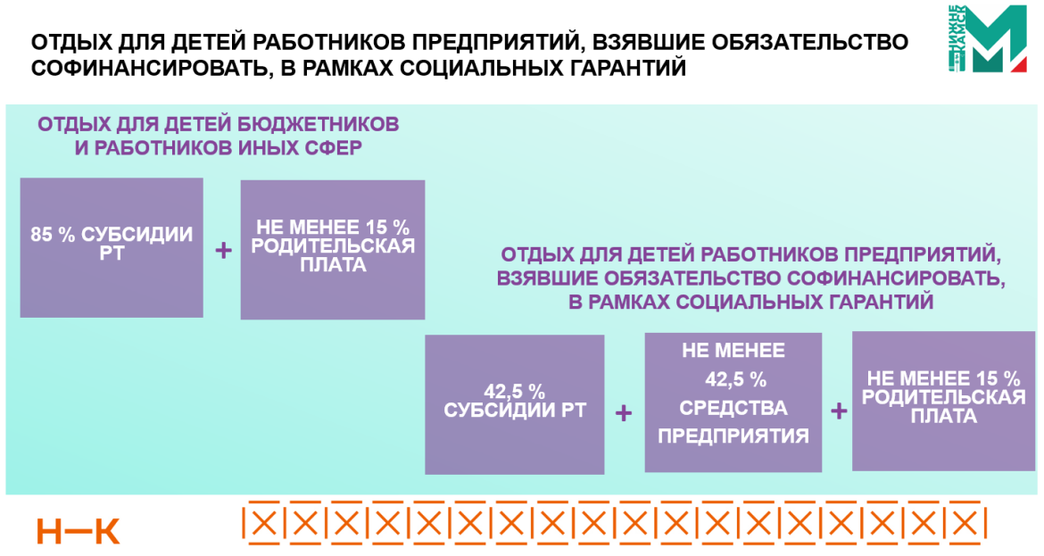 Средства пойдут на долевую оплату путевок. Республика возьмет на себя 85% расходов на оплату отдыха детей бюджетников в палаточных, пришкольных и стационарных лагерях. Размер родительской платы устанавливается в размере не менее 15% от нормативной стоимости путевки — 18,9 тыс. рублей, родительский взнос составляет от 2,8 тыс. рублей.