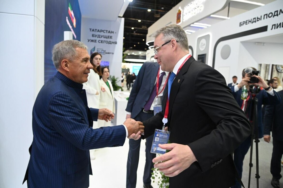 Раис Татарстана Рустам Минниханов встретился с губернатором Ставропольского края Владимиром Владимировым на полях Петербургского международного экономического форума. Они договорились расширять взаимодействие и подписали соглашение о сотрудничестве между регионами.