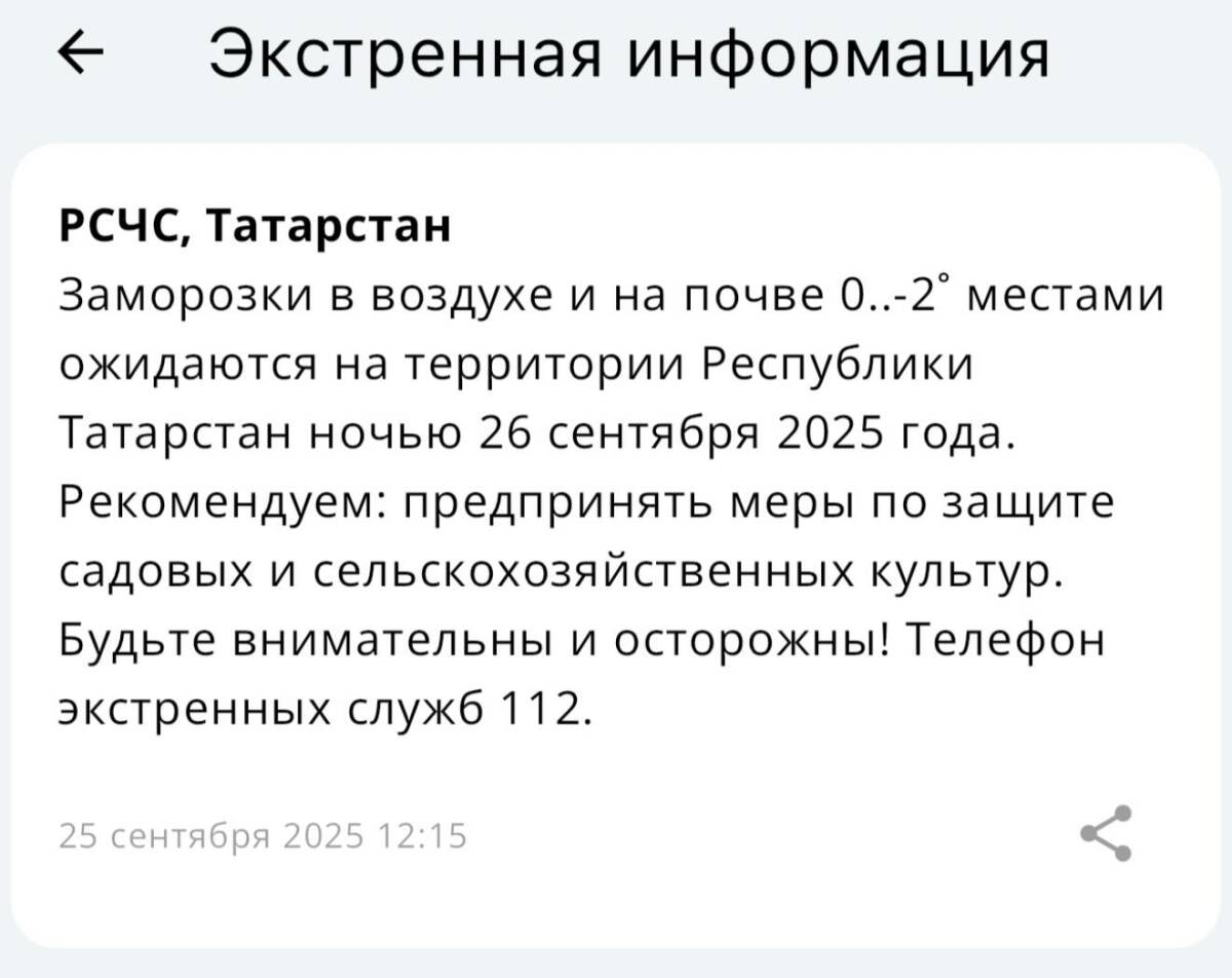 В пятницу, 26 сентября, на территории республики местами вероятны заморозки в воздухе и на почве. Температура может опускаться до -2°C. Об этом информирует Гидрометцентр РТ.