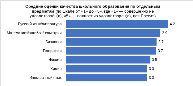 Лучше всего, по мнению участников опроса, в школе учили русскому языку и литературе (4,2 балла из 5), а также математике (3,9 балла из 5). Хуже всего, уверены они, их обучали иностранному языку и химии (по 3,3 балла).
