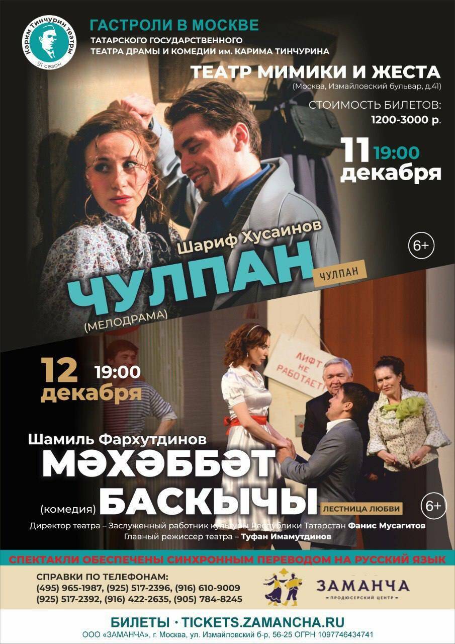 Так, 11 декабря москвичам представят мелодраму «Чулпан» по Ш.Хусаенова, а 12 декабря – комедию «Лестница любви» («Мәхәббәт баскычы») по пьесе Ш. Фархутдинова.