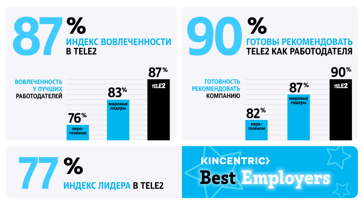 Помимо этого, по итогам исследования Tele2 была сертифицирована как лучший работодатель в России по методологии Kincentric. Это звание получают компании, в которых вовлеченность, гибкость и адаптивность, вовлекающее лидерство и фокус на сотрудников достигают выдающихся значений по сравнению с другими организациями.