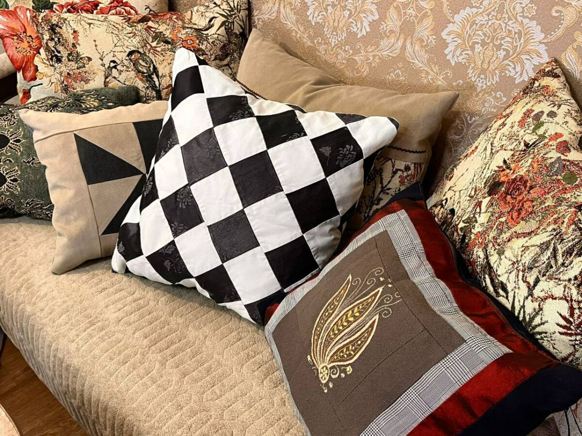 При шитье Галина Мартыновна использует разные техники, в зависимости от материала. Она переживает, что ткани дома почти не осталось. Сейчас волонтер работает с тем, что принесли дети, поэтому любой помощи в виде материала для подушек будет рада.