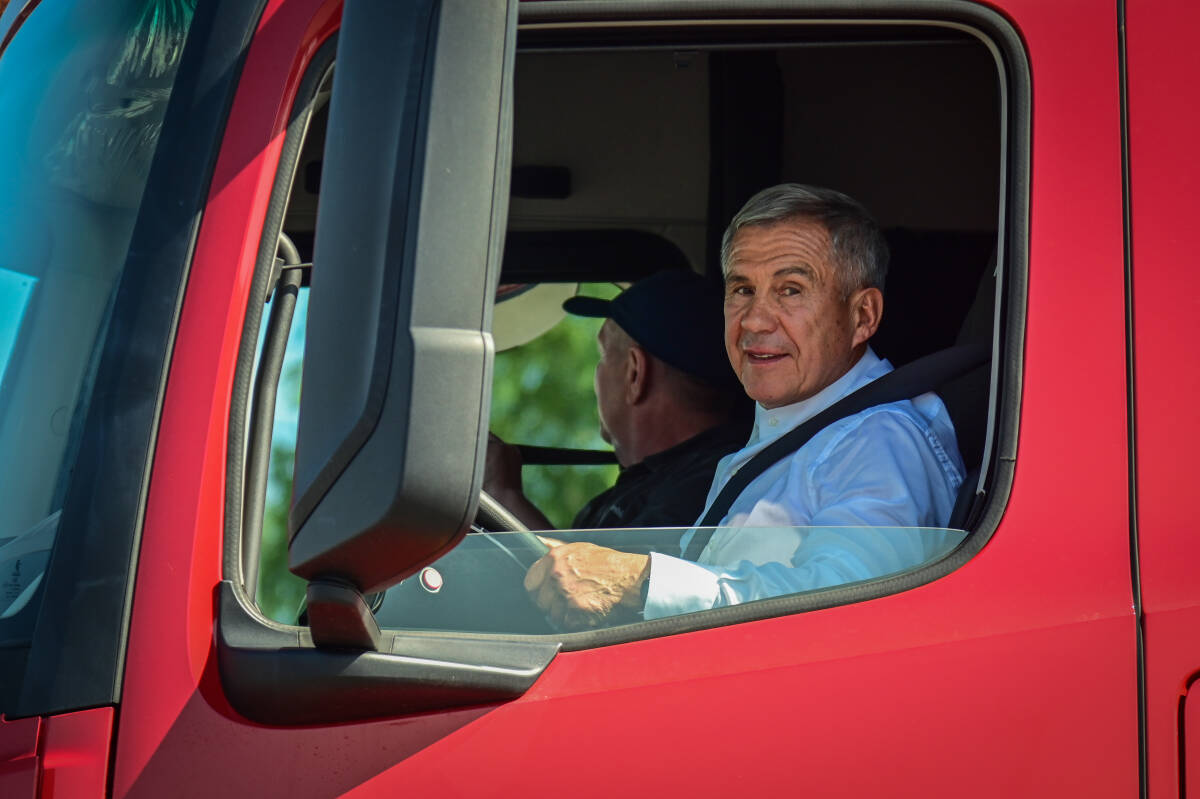 Рустам Минниханов прокатился на тягаче бордового цвета модели КАМАЗ-54902