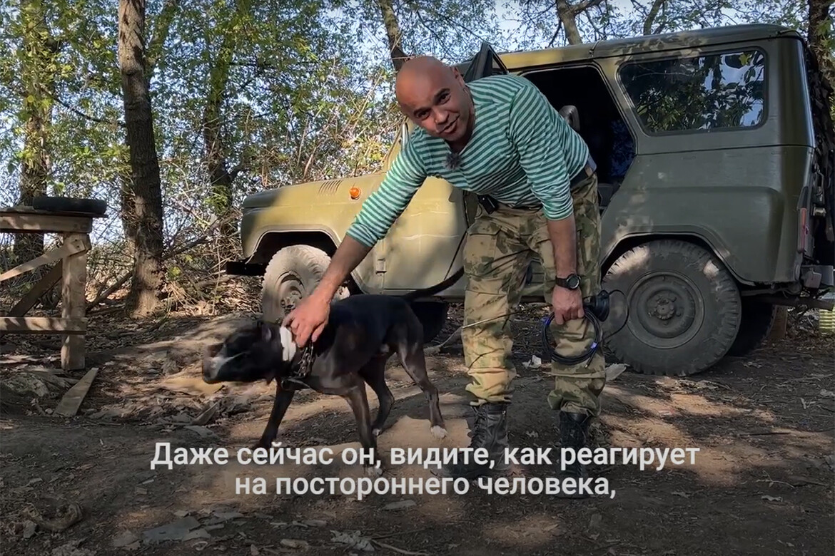 Увидев военкора – постороннего человека, собака встала в боевую стойку. Он воспринимает съемочную аппаратуру как угрозу для хозяина.