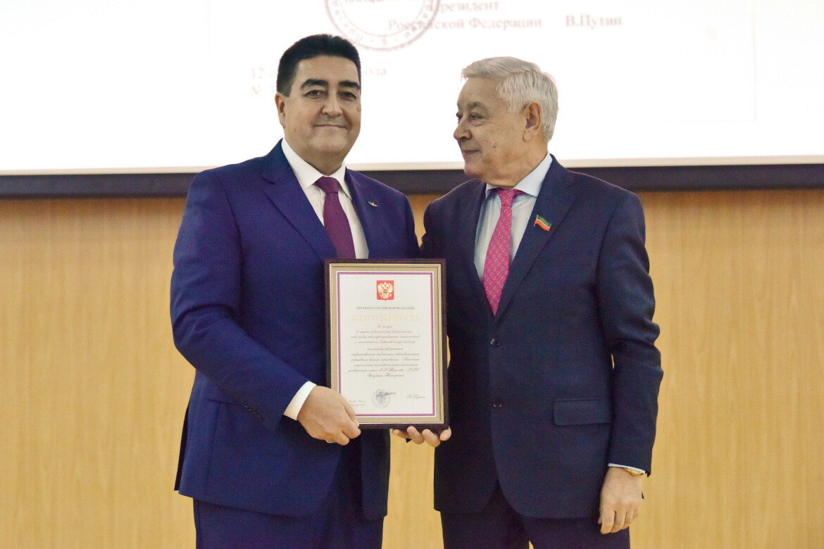 Кроме того, сегодня же Фарид Мухаметшин вручил государственные награды профессорам и преподавателям вуза, ведущим активную исследовательскую деятельность. Коллектив КНИТУ-КАИ поощрен Благодарностью Президента РФ Владимира Путина.