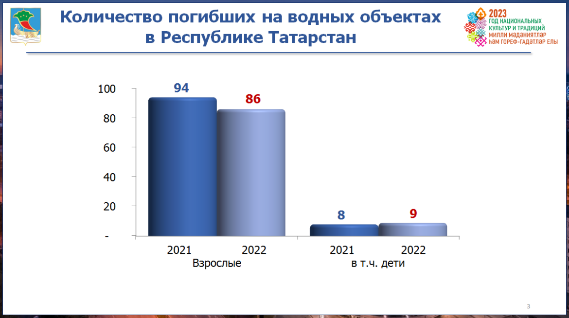 Докладчик отметил, что в целом по Татарстану в 2022 году количество погибших на водных объектах уменьшилось. Так, в РТ утонуло 86 человек, из них 9 детей (в 2021-м — 94 человека, из них 8 детей), спасено 105 человек, из них 11 детей.
