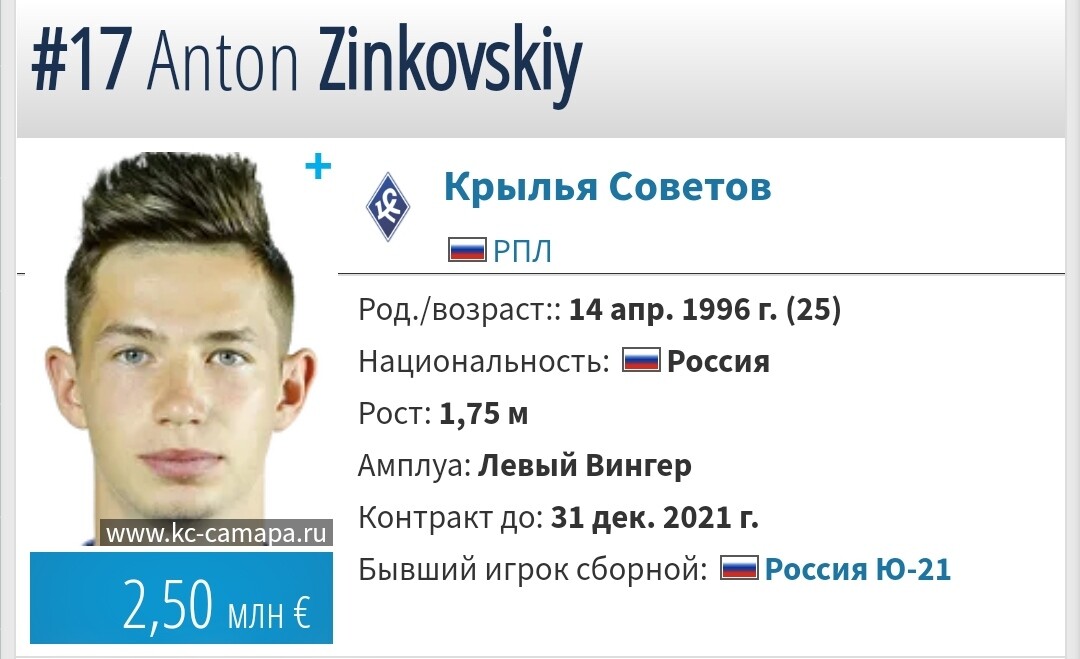 Казанский «Рубин» рассматривает вариант с приобретением флангового полузащитника самарских «Крыльев Советов» Антона Зиньковского. Предполагается, что он сможет заменить в команде Дениса Макарова, который подписал с московским «Динамо» пятилетний контракт.