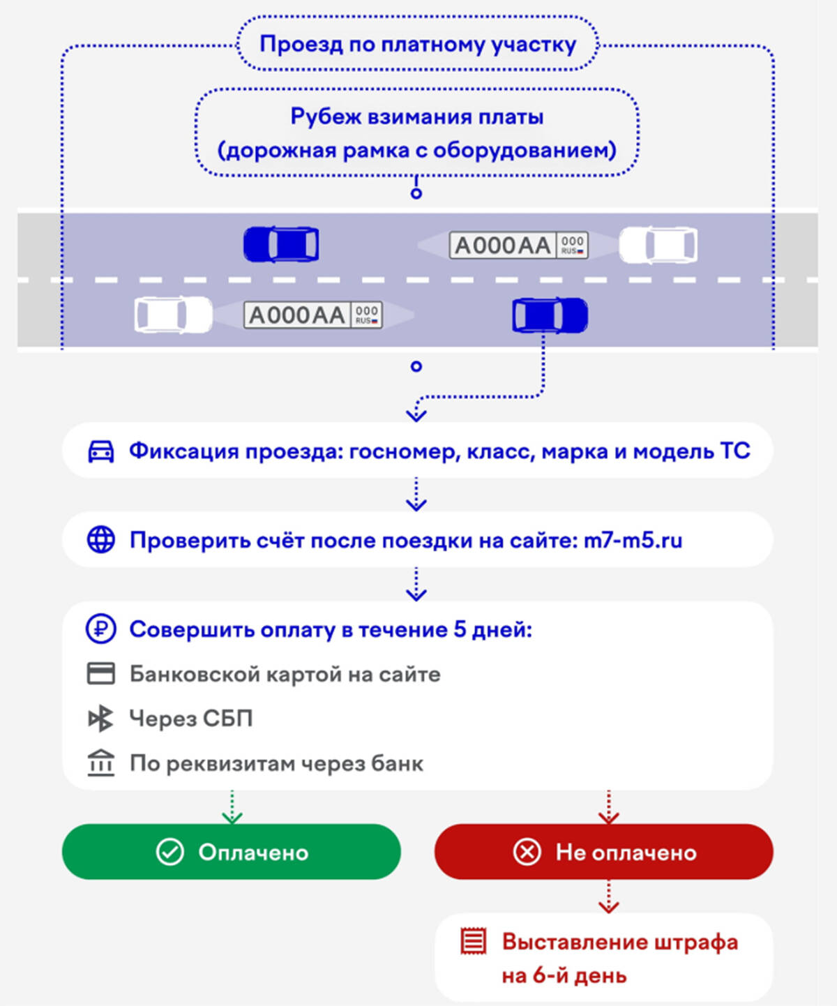 За неоплату проезда в течение пяти суток владелец транспортного средства привлекается к административной ответственности – на шестой день ему выставляется штраф. Для легковых автомобилей он составит 1,5 тыс. рублей, для грузовиков и автобусов – 5 тыс. рублей.