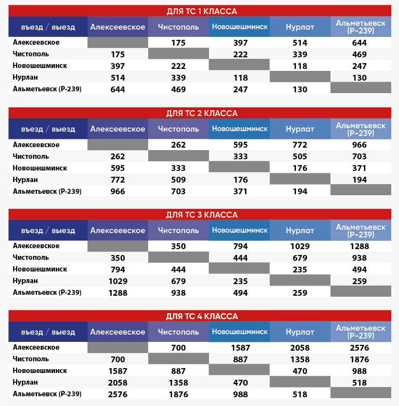 Стоимость проезда по автодороге Алексеевское – Альметьевск зависит от класса транспортного средства: