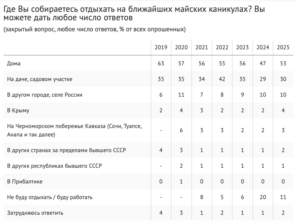 Туристические поездки на майские выходные привлекают немногих, и чаще всего это «внутренний туризм». В этом году, как выяснил ВЦИОМ, в тройку наиболее популярных направлений россиян вошли две столичные агломерации – Москва (15%) и Санкт-Петербург (7%), а также Казань (5%). Выездной туризм (в другой город или село страны), по данным опроса, обойдется в 2025-м вдвое дороже, чем отдых дома (34,5 против 16 тыс. рублей). Отсюда и вынужденная «оседлость», которую выбирает большинство россиян.