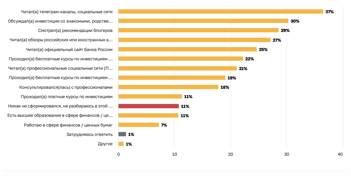 Другие тревожные выводы – значительная доля респондентов (44%) не считают необходимым сформировать перед инвестированием финансовую «подушку безопасности», «что говорит о недостаточном понимании рисков инвестиционной деятельности». А для принятия инвестиционных решений наши люди обращаются главным образом к телеграм-каналам, знакомым и блогерам. Лишь четверть использует для этого профессиональную аналитику или хотя бы сайт Банка России!