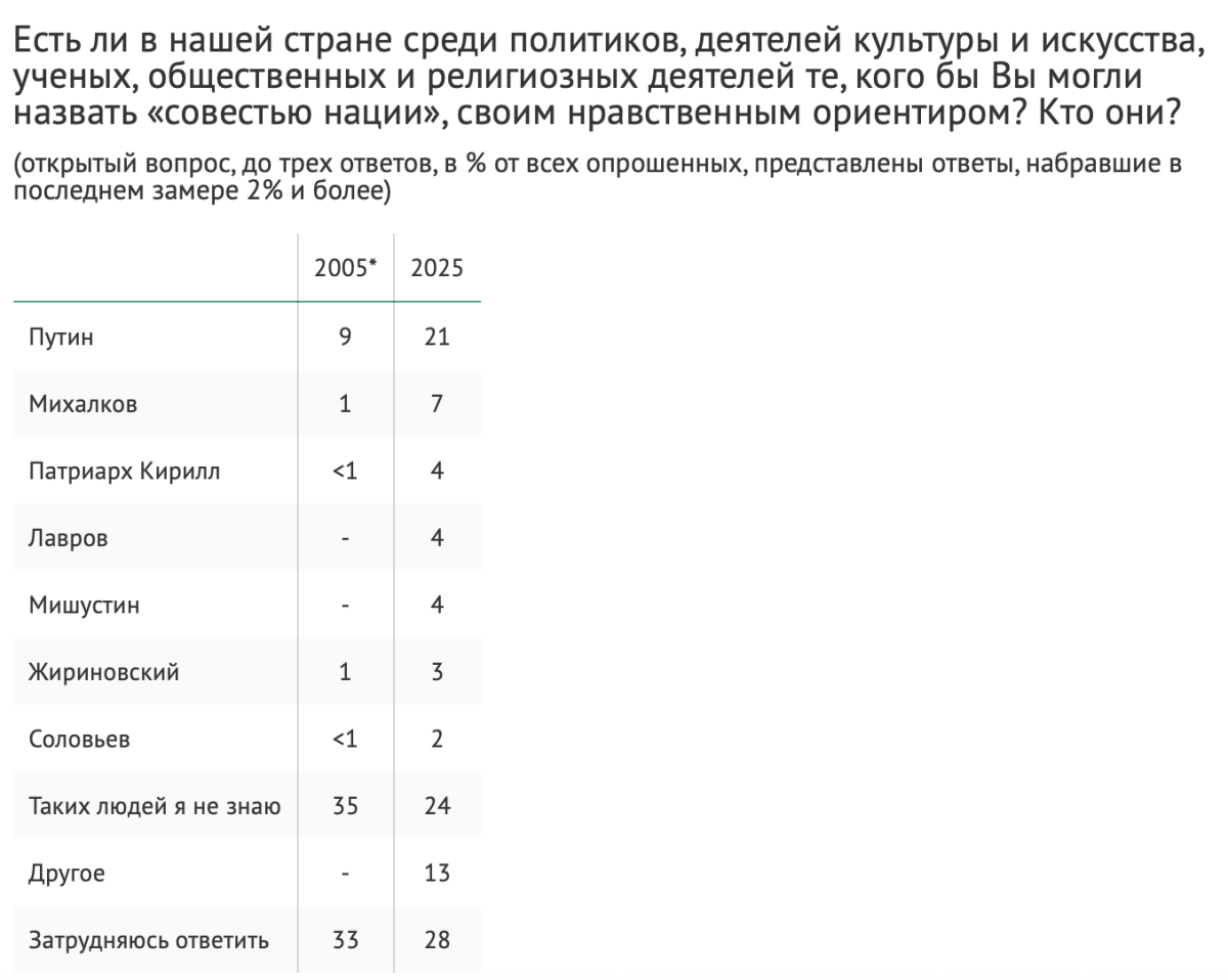 Самый же грустный вывод исследования – явный дефицит моральных авторитетов в современном российском обществе. Спонтанно назвать имена таких персон смог каждый второй опрошенный. Понятно, что упоминаемость лидера народного рейтинга Владимира Путина за последние 20 лет выросла вдвое. Также в ответах «единично» фигурировали Никита Михалков, покойный Владимир Жириновский, телеведущий Владимир Соловьев и Патриарх Кирилл.