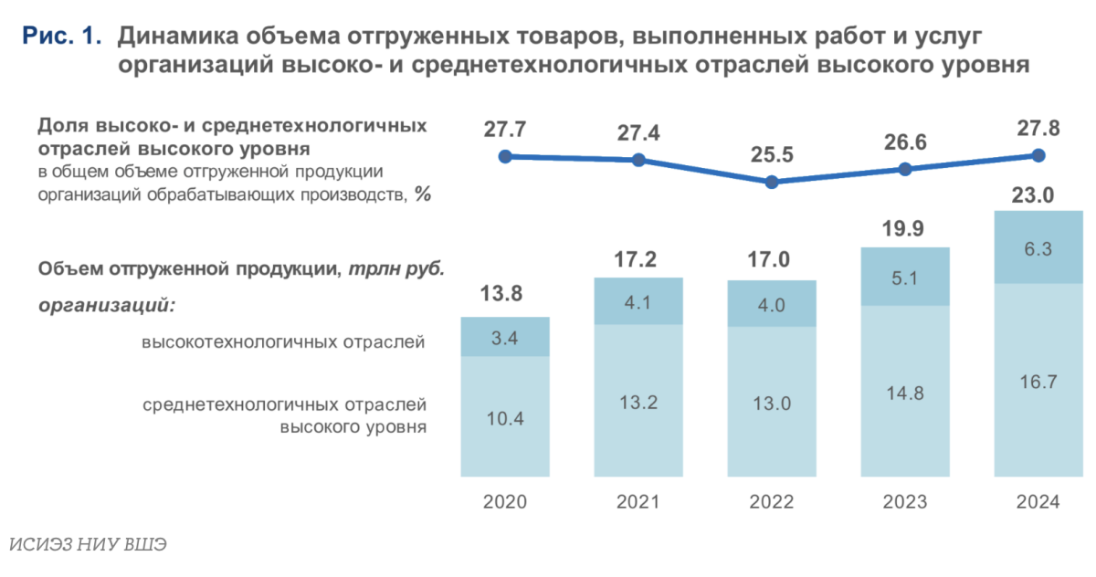 По данным ИСИЭЗ НИУ ВШЭ, в последние годы в обрабатывающей промышленности России активно растет и выпуск продукции высокотехнологичных видов деятельности, которые «создают основу для технологического лидерства и устойчивого развития страны». В 2024-м отгрузка в этих отраслях составила 6,3 трлн рублей (рост на 14,2% к 2023-му в постоянных ценах). А с учетом продукции среднетехнологичных отраслей высокого уровня – 23 трлн рублей (рост на 6% к 2023-му). То есть эти виды деятельности обеспечили более четверти (27,8%) всех товаров, работ и услуг в обрабатывающей промышленности страны. Одна ложка дегтя: такой уровень в индустрии уже достигали, но... пять лет назад.