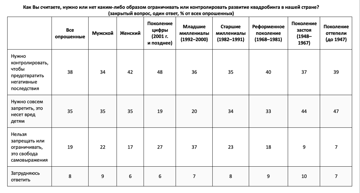 Однако консенсуса по вопросу «запретить или контролировать» в обществе нет, более того, это вопрос даже не «отцов и детей», а «дедушек и внуков». Молодые россияне (зумеры и младшие миллениалы) в меньшей степени готовы подержать полный запрет квадроберов (19-20%), зумерам ближе вариант контроля (48%), тогда как россияне старшего возраста (поколения застоя, оттепели) чаще других выступают за полный запрет квадробики (44-47%).