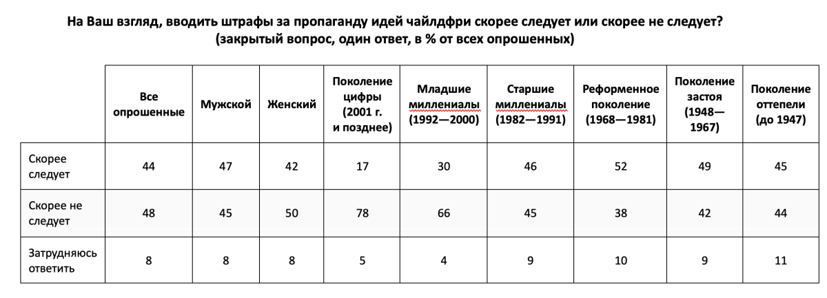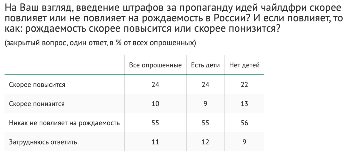 Также выяснилось, что большая часть (55%) уверена – введение штрафов за пропаганду чайлдфри никак не повлияет и на рождаемость в стране. «Значительная часть общества не согласна с тем, что пропаганда бездетного образа жизни реально влияет на решения людей о деторождении. Возможно, они видят в этом вопросе более глубокие социальные и экономические факторы, которые определяют решение о рождении детей», – обтекаемо заключили во ВЦИОМ.