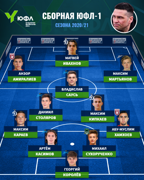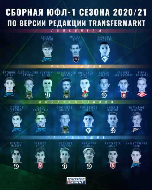 Юношеская футбольная лига совместно с Transfermarkt определила сборную из лучших 23-х игроков минувшего сезона в ЮФЛ-1. В нее вошли представители девяти клубов, в том числе три игрока казанского «Рубина». Это защитник Абу-Муслим Хамхоев, а также нападающие Артем Зияисов и Анзор Амиралиев.