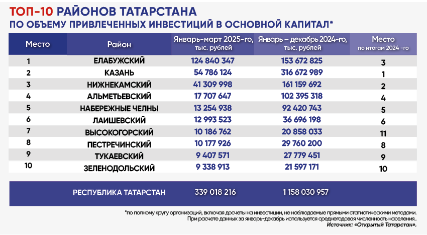Среди муниципальных образований Татарстана первое место занял Елабужский район с 124,8 млрд рублей привлеченных средств, на второе место сместилась Казань с объемом 54,8 млрд рублей, на третьем – Нижнекамский район с суммой вложений 41,3 млрд рублей.